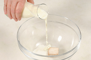Misture bem o fermento com metade do leite quente e 1 colher de açúcar em um bowl.